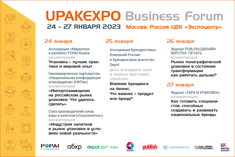 Актуальные мировые тренды, свежая аналитика и прогнозы рынка, потребительские инсайты, опыт лидеров отрасли и важнейшие задачи, стоящие перед отечественной упаковочной индустрией в период турбулентности, — всё это и многое другое обсудим с представителями отраслевых ассоциаций, авторитетными экспертами и ведущими игроками упаковочного рынка 24-27 января в рамках UPAKEXPO BUSINESS FORUM. Участие в деловой программе выставки для экспонентов бесплатное.